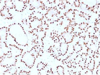 Fig. 1: Formalin-fixed, paraffin-embedded human thyroid carcinoma stained with Cyclin D1 Mouse Monoclonal Antibody (CCND1/2593).