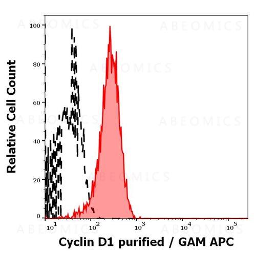 Figure 1: Separation of MCF-7 cells stained using anti-Cyclin D1 (CD1.1) purified antibody (GAM APC, red-filled) from MCF-7 cells stained using mouse IgG1 isotype control (MOPC-21) purified antibody (GAM APC, black-dashed) in flow cytometry analysis (intracellular staining).