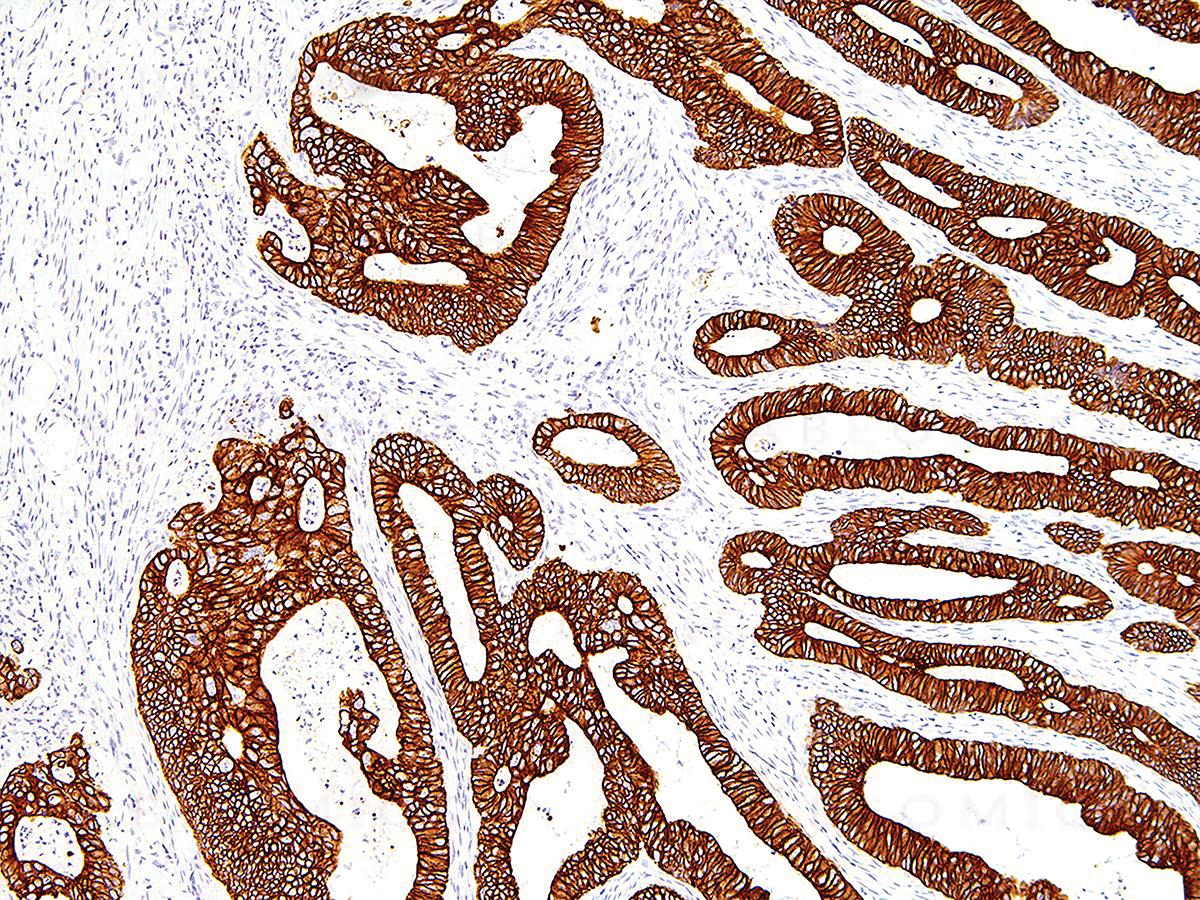 "Cytokeratin 19 (CK19) forms intermediate filaments found in the intracytoplasmic cytoskeleton of epithelial tissue and provides mechanical support. Anti-Cytokeratin 19 stains epithelia and epithelial malignancies such as carcinomas of the colon, stomach, pancreas, biliary tract, liver, and breast. Cytokeratin 19 is a useful marker for distinguishing hepatocellular carcinoma from intrahepatic cholangiocarcinoma. This differentiation is improved when stained in combination with Cytokeratin 7, CAM5.2l, Ber-EP4/MOC31, HepPar1 and TTF1. Cytokeratin 19 staining can also be used to recognize thyroid papillary carcinomas."