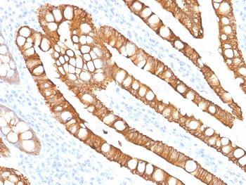 Fig. 1: Formalin-fixed, paraffin-embedded human Colon Carcinoma stained with Cytokeratin 20 (KRT20) Mouse Monoclonal Antibody (SPM191).