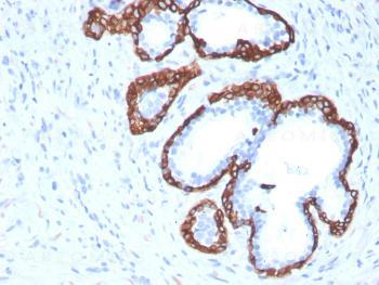 Fig. 1: Formalin-fixed, paraffin-embedded human Prostate Carcinoma stained with Cytokeratin 5 Mouse Monoclonal Antibody (KRT5/3594).