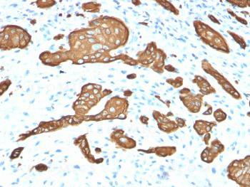 Fig. 1: Formalin-fixed, paraffin-embedded human Skin Basal Cell Carcinoma stained with Cytokeratin 8 Mouse Monoclonal Antibody (KRT8/2115).
