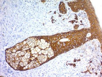 Fig. 1: Formalin-fixed, paraffin-embedded human Skin stained with Cytokeratin, HMW Rabbit Recombinant Monoclonal Antibody (KRTH/1576R).