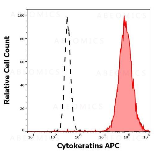 Figure 1: Separation of HeLa cells stained using anti-Cytokeratins (C-11) APC antibody (concentration in sample 5 μg/ml, red-filled) from HeLa cells stained using mouse IgG1 isotype control (MOPC-21) APC antibody (concentration in sample 5 μg/ml, same as Cytokeratins APC concentration, black-dashed) in flow cytometry analysis (intracellular staining).
