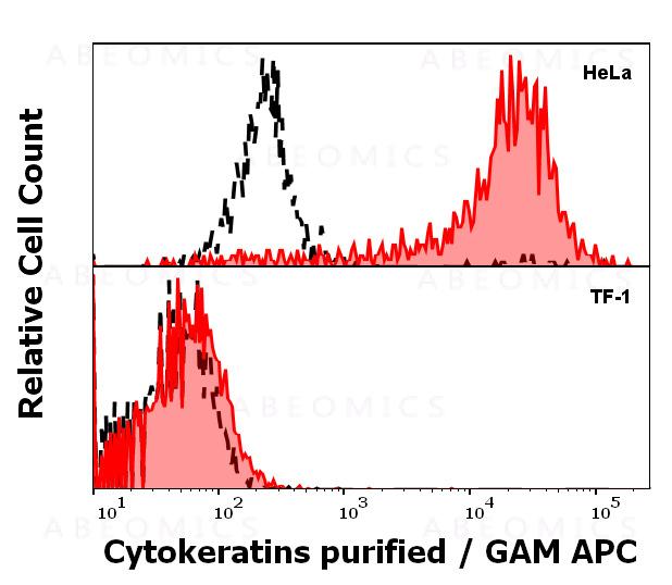 Figure-1: Anti-Hu Cytokeratins purified antibody (clone C-11) specificity verification by flow cytometry Anti-Cytokeratins (C-11) purified antibody (concentration in sample 0.3 μg/ml, GAM APC, red-filled histogram) binds specifically to intracellular cytokeratins in permeabilized HeLa cells (upper panel), but does not stain permeabilized TF-1 cells (lower panel). Level of non-specific binding was assessed using cells unstained by primary antibody (GAM APC, black-dashed histogram).