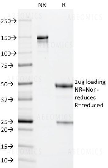 Fig. 1: SDS-PAGE Analysis Purified CMV-p65 Mouse Monoclonal Antibody (CMV101). Confirmation of Purity and Integrity of Antibody.