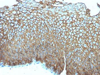 Fig. 1: Formalin-fixed, paraffin-embedded human Esophageal Carcinoma stained with Desmoglein-3 Mouse Monoclonal Antibody (DSG3/2839).