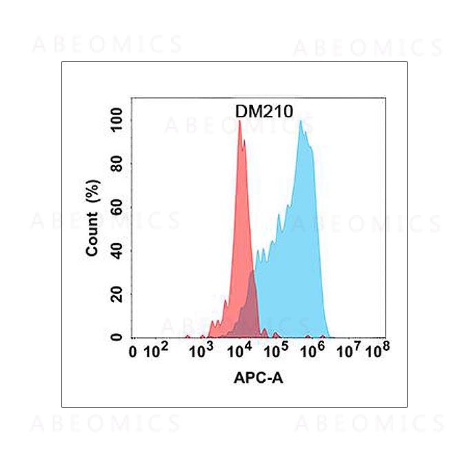 Figure 1. Flow cytometry analysis with Anti-DKK1 (DM210) on Expi293 cells transfected with human DKK1 (Blue histogram) or Expi293 transfected with irrelevant protein (Red histogram).