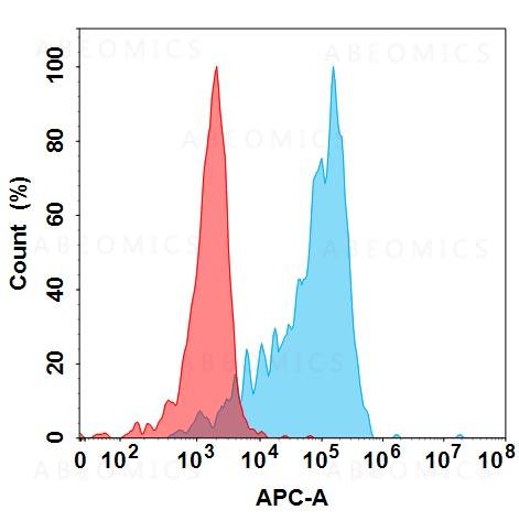 Figure 1. Flow cytometry analysis under cell membrane permeable condition with 1 μg/mL Anti-DKK1 (sirexatamab biosimilar) mAb on Expi293 cells transfected with Human DKK1 protein (Blue histogram) or Expi293 transfected with irrelevant protein (Red histogram).