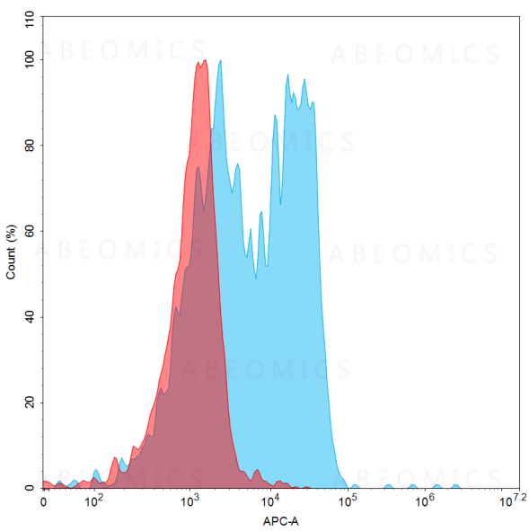 Figure 1. Flow cytometry analysis with Anti-DLL3 (Rovalpituzumab biosimilar) mAb 15 µg/ml on Expi293 cells transfected with Human DLL3 (Blue histogram) or Expi293 transfected with irrelevant protein (Red histogram).