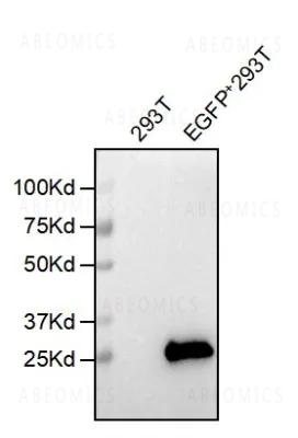 Figure 1. WB examination of Rabbit anti-EGFP mAb. 293T were transfected with or without EGFP and cell lysates were subjected to WB examination. Cells expressing EGFP show clear positive band at correct position.