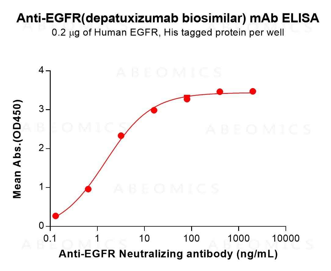 Figure 1. ELISA plate pre-coated by 2 μg/mL (100 μL/well) Human EGFR Protein, His Tag can bind Anti-EGFR(depatuxizumab biosimilar) mAb (12-90039) in a linear range of 0.13–16 ng/mL.