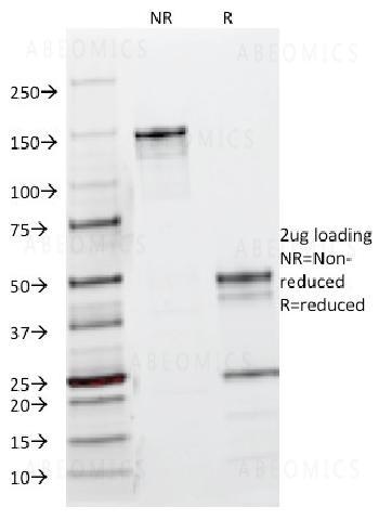 Fig. 1: SDS-PAGE Analysis Purified EGFR Mouse Monoclonal Antibody (B1D8). Confirmation of Integrity and Purity of Antibody.