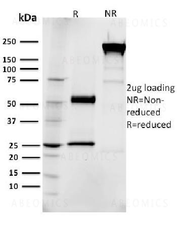 Fig. 1: SDS-PAGE Analysis Purified EGFR Mouse Monoclonal Antibody (R1). Confirmation of Integrity and Purity of Antibody.