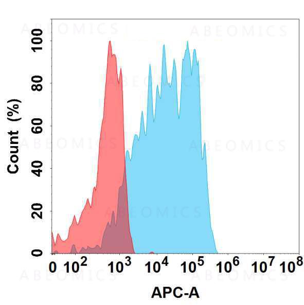 Figure 1. Flow cytometry analysis with Anti-EGFRVIII (2E12) mAb on Expi293 cells transfected with human EGFRVIII (Blue histogram) or Expi293 transfected with irrelevant protein (Red histogram).