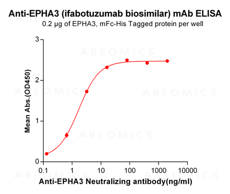 Figure-1: ELISA plate pre-coated by 2 μg/ml (100 μl/well) Human EPHA3, mFc-His tagged protein can bind Anti-EPHA3 Neutralizing antibody in a linear range of 0.13-16.0 ng/ml.