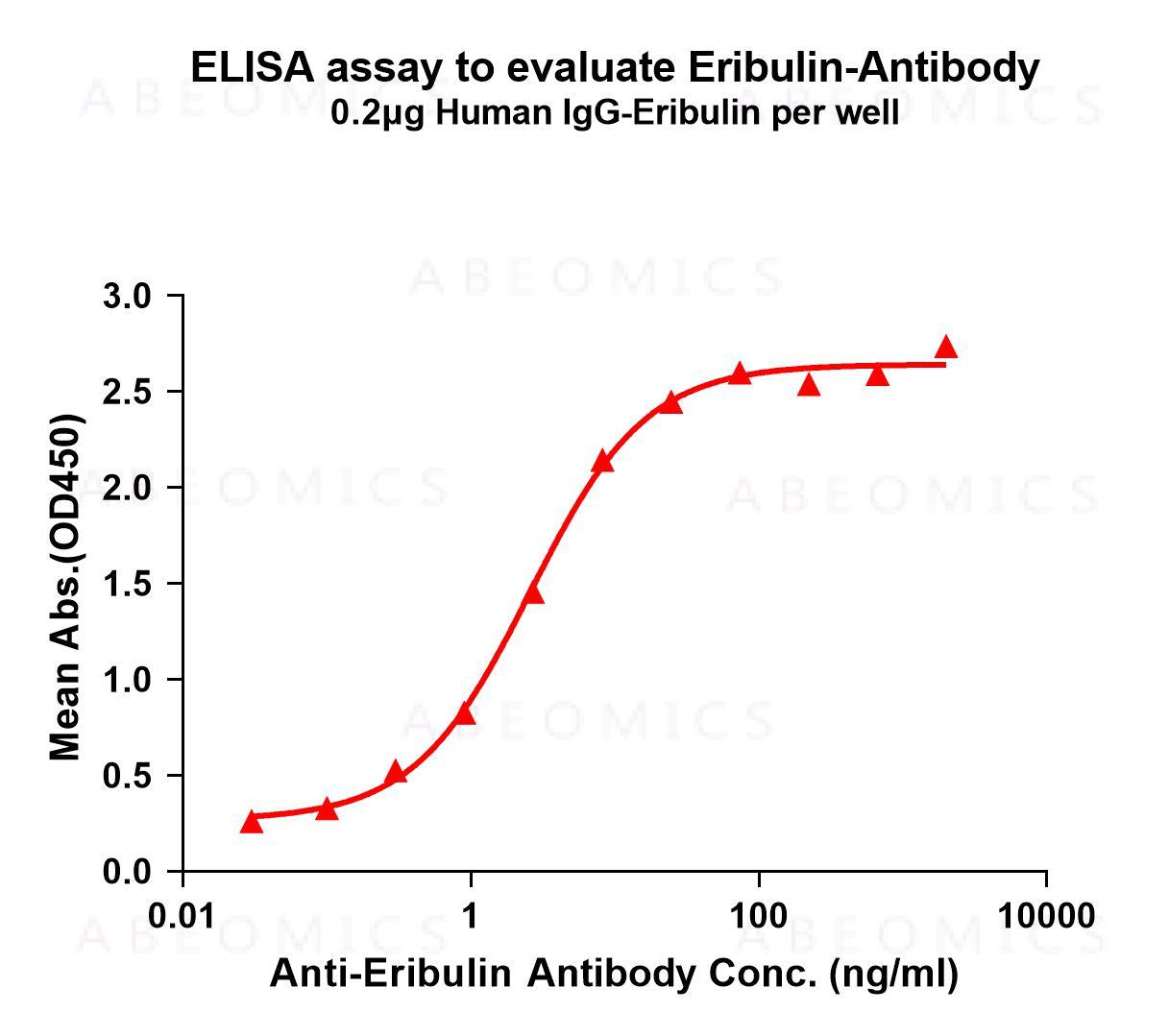 Figure 1. Elisa plates were pre-coated with IgG-Eribulin (0.2μg/per well). Serial diluted anti-Eribulin monoclonal antibody (12-9653) solutions were added, washed, and incubated with secondary antibody before Elisa reading. From above data, the EC50 for anti-Eribulin monoclonal antibody binding with IgG-Eribulin is 2.587ng/ml.