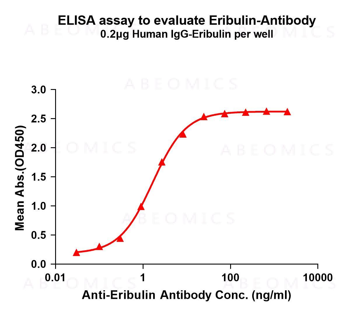 Figure 1. Elisa plates were pre-coated with IgG-Eribulin (0.2μg/per well). Serial diluted anti-Eribulin monoclonal antibody (12-9654) solutions were added, washed, and incubated with secondary antibody before Elisa reading. From above data, the EC50 for anti-Eribulin monoclonal antibody binding with IgG-Eribulin is 1.670ng/ml.