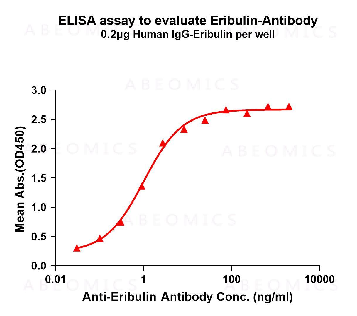 Figure 1. Elisa plates were pre-coated with IgG-Eribulin (0.2μg/per well). Serial diluted anti-Eribulin monoclonal antibody (12-9655) solutions were added, washed, and incubated with secondary antibody before Elisa reading. From above data, the EC50 for anti-Eribulin monoclonal antibody binding with IgG-Eribulin is 1.012ng/ml.