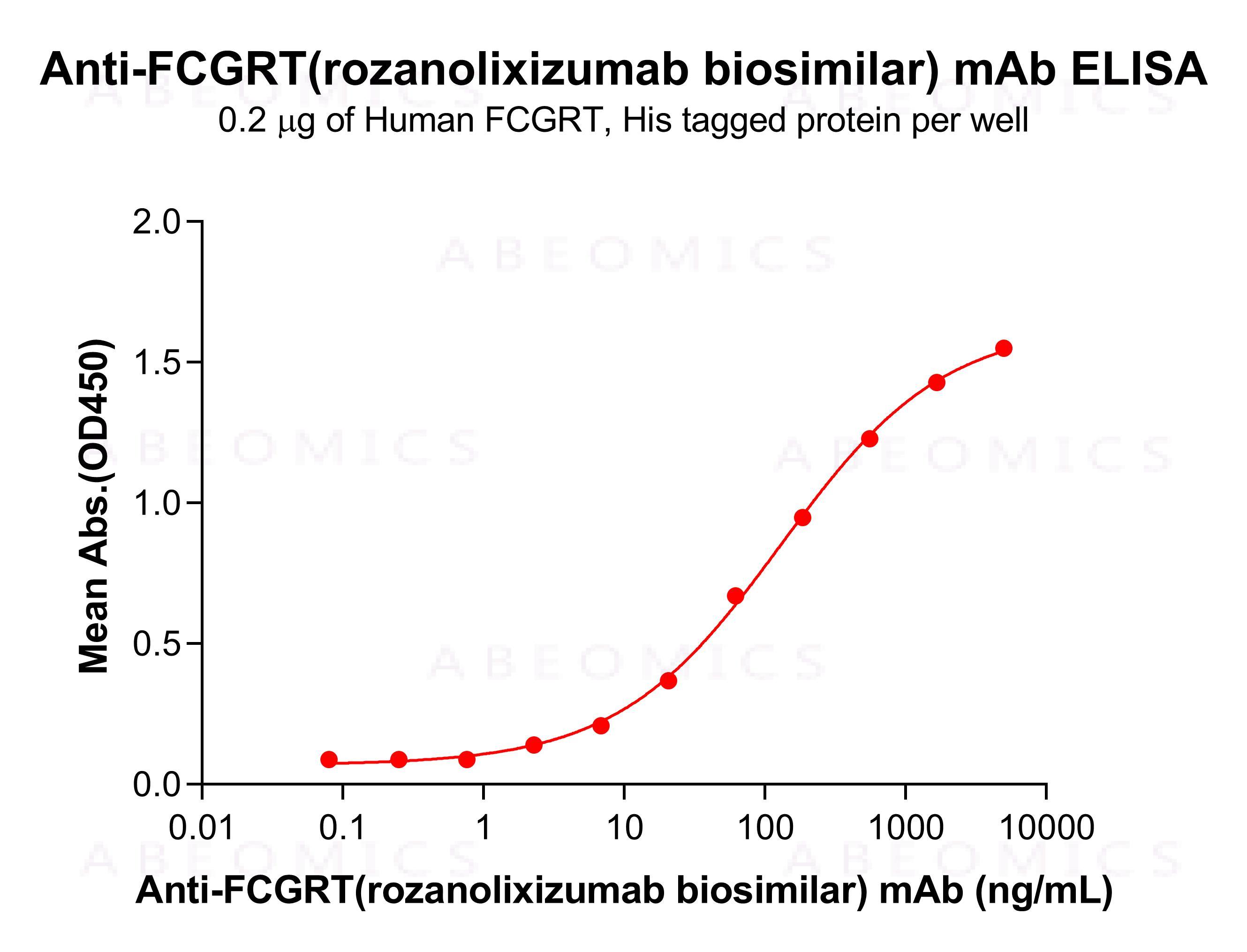 Figure 1: ELISA plate pre-coated by 2 μg/mL (100 μL/well) Human FCGRT Protein, His Tag can bind Anti-FCGRT(rozanolixizumab biosimilar) mAb in a linear range of 6.86–555.56 ng/mL.