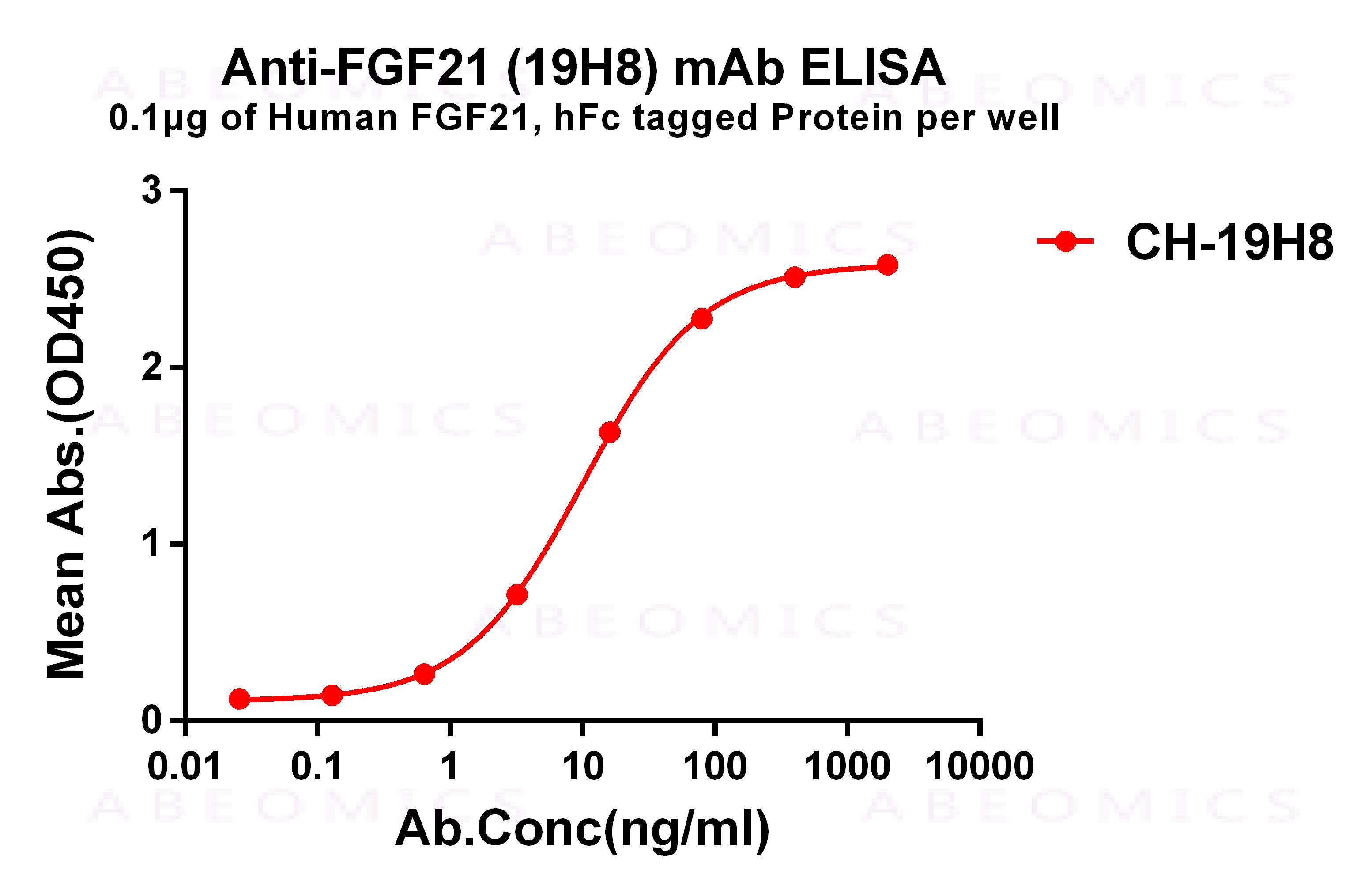Figure 1. ELISA plate pre-coated by 1 μg/ml (100 μl/well) Human FGF21, hFc tagged protein can bind Rabbit anti-FGF21 monoclonal antibody(clone: 19H8) in a linear range of 10-100 ng/ml.