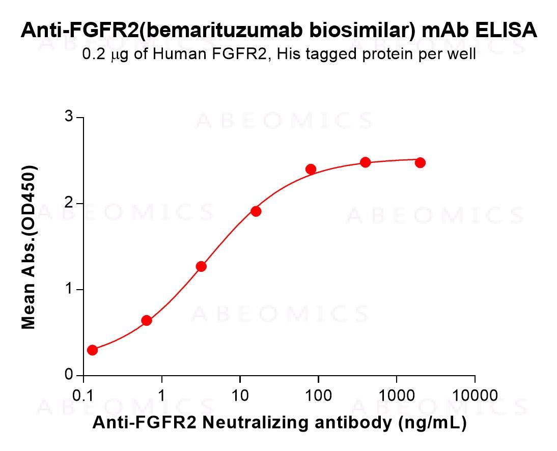 Figure 1. ELISA plate pre-coated by 2 µg/mL (100 µL/well) Human FGFR2 Protein, His Tag can bind Anti-FGFR2(bemarituzumab biosimilar) mAb in a linear range of 0.13–16 ng/mL.