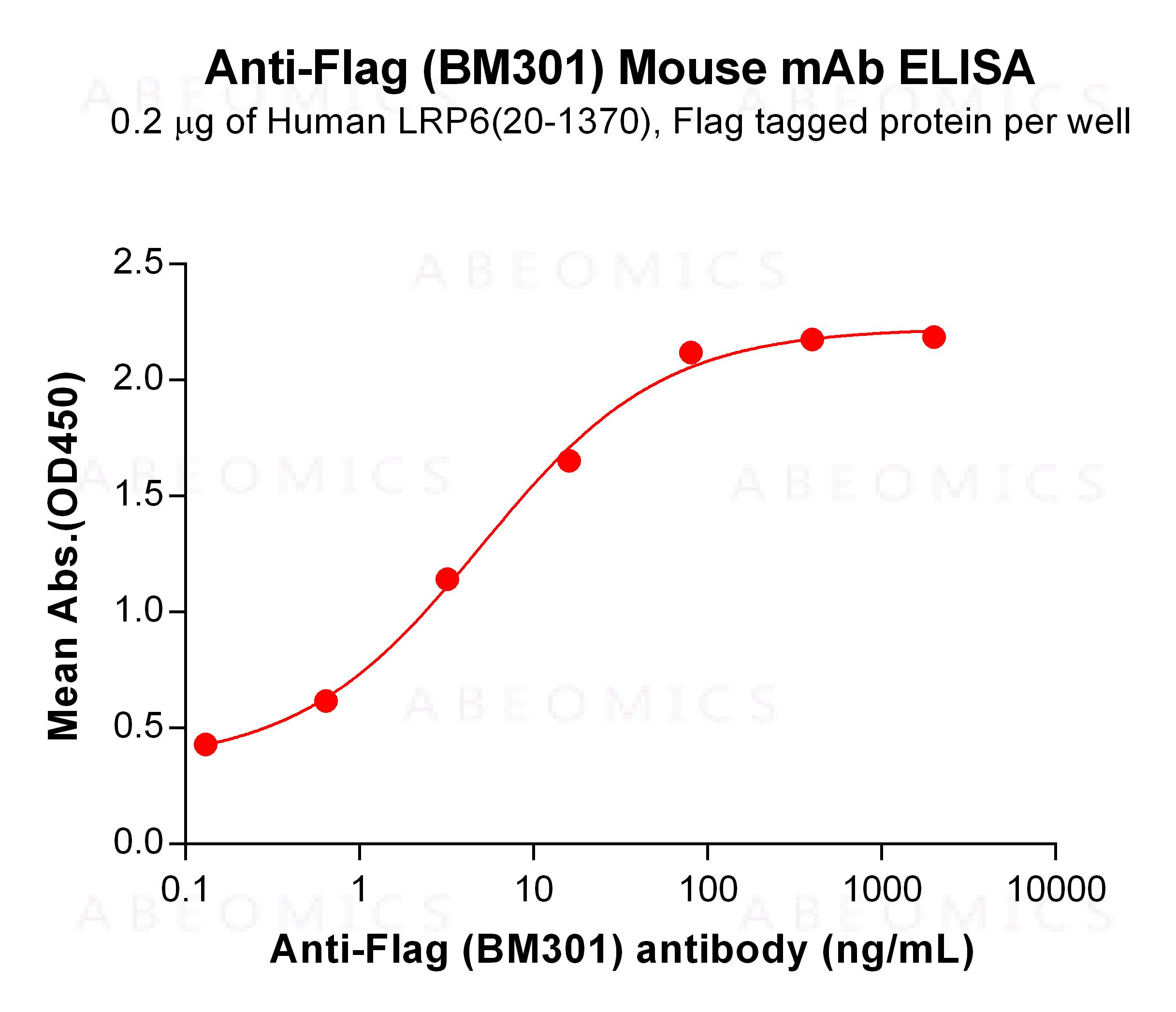 Figure 1. ELISA plate pre-coated by 2 µg/mL (100 µL/well) Human LRP6(20-1370) Protein, Flag Tag can bind Anti-Flag (BM301) Mouse mAb in a linear range of 0.64–80 ng/mL.