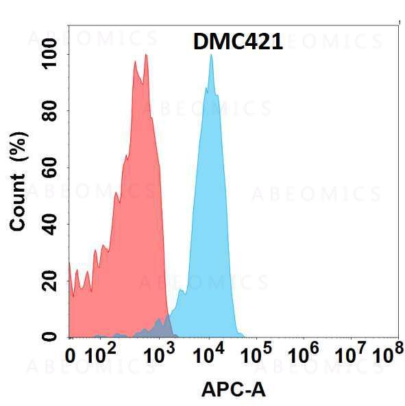 Figure 1. Flow cytometry analysis with Anti-FLT3LG (DMC421) on Expi293 cells transfected with human FLT3LG (Blue histogram) or Expi293 transfected with irrelevant protein (Red histogram).
