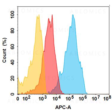 Figure 1. FOLR1 protein is highly expressed on the surface of Expi293 cell membrane. Flow cytometry analysis with 1μg/mL Anti-FOLR1(mirvetuximab biosimilar) mAb on Expi293 cells transfected with human FOLR1 (Blue histogram) or Expi293 transfected with irrelevant protein (Red histogram),and Isotype antibody on Expi293 transfected with irrelevant protein (Orange histogram).