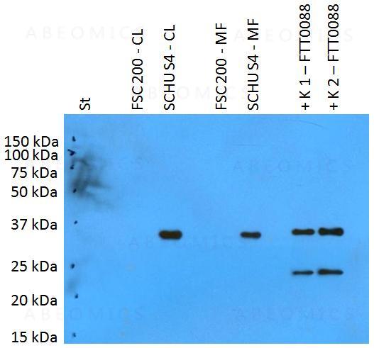 Figure 1:Western blotting analysis of polyclonal anti-Francisella tularensis subsp. tularensis antigen FTT0088. St: Mw marker FSC200-CL: 10 µg of F. tularensis ssp. holarctica FSC200 cell lysateSCHUS4-CL: 10 µg of F. tularensis ssp. tularensis SCHU S4 cell lysateFSC200-MF: 10 µg of F. tularensis ssp. holarctica FSC200 membrane fractionSCHUS4-CL: 10 µg of F. tularensis ssp. tularensis SCHU S4 membrane fraction K1: 50 ng of FTT0088 recombinant proteinK2: 125 ng of FTT0088 recombinant protein
