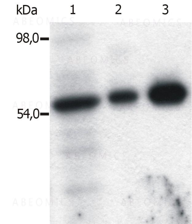Figure 1: Immunoprecipitation of Fyn from the lysate of T cells isolated from fresh buffy coats. Western blot was immunostained with anti-Fyn (FYN-01). Lane 1: original lysate of T cells. Lane 2-3: Immunoprecipitated material eluted from affinity sorbent (FYN-01 coupled to Sepharose beads). Lanes differ in amount of T cell lysate loaded on the immunosorbent.
