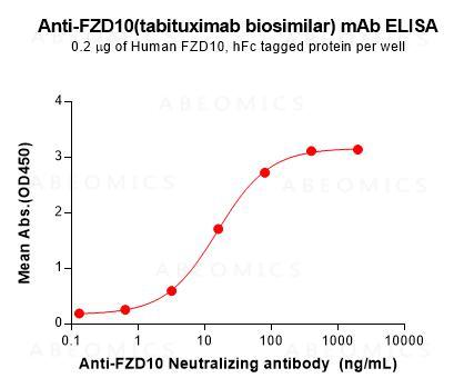 Figure 1. ELISA plate pre-coated by 2 μg/mL (100 μL/well) Human FZD10 Protein, hFc Tag can bind Anti-FZD10(tabituximab biosimilar) mAb in a linear range of 3.20-80 ng/mL.In order to specifically detect, mouse anti-human Fab-specific antibody was used as detection antibody.