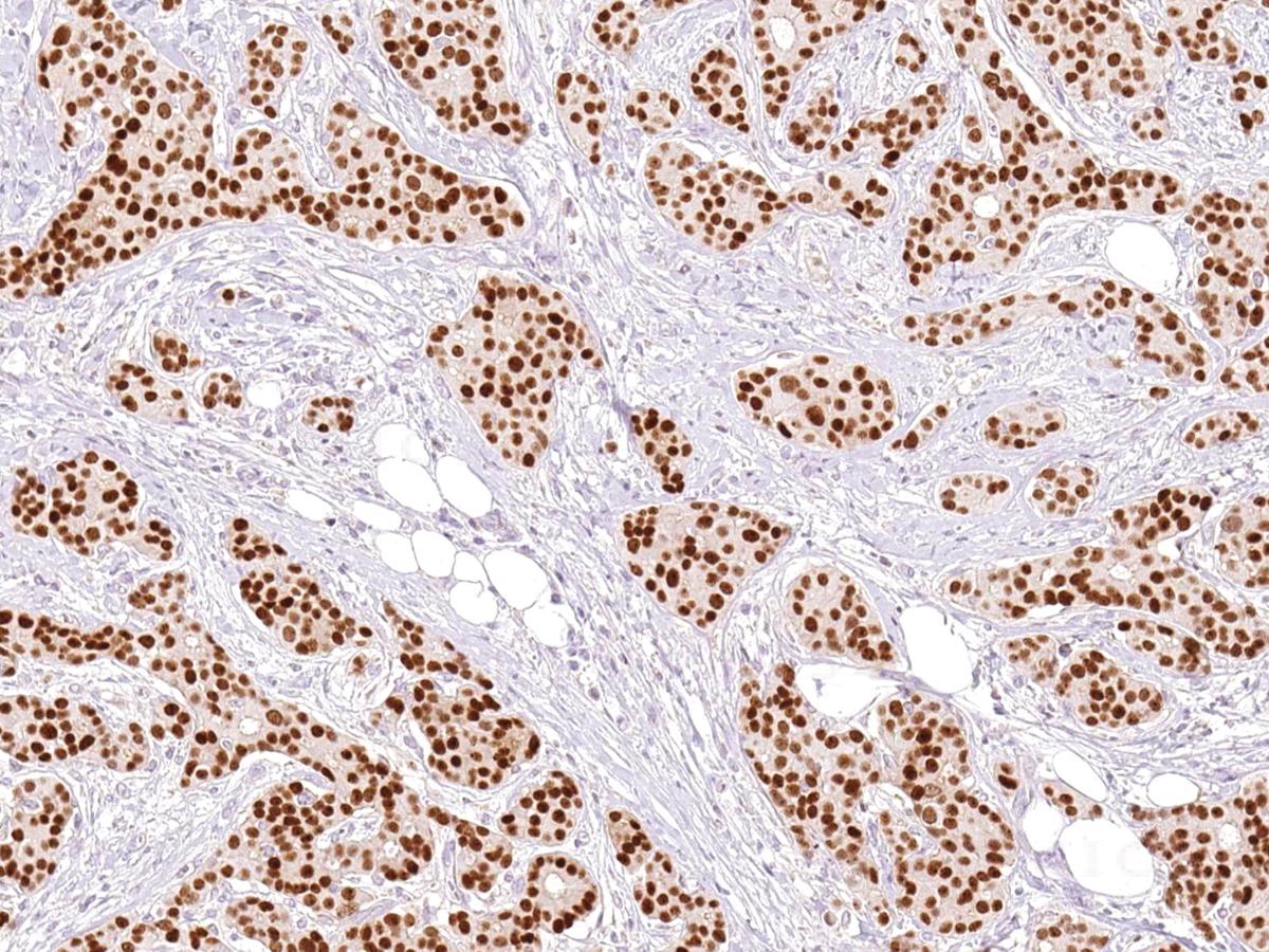 GATA3 is a transcription factor important in cell proliferation, development, and differentiation. GATA3 is mostly observed in breast and urothelial carcinomas, and rarely present in other cancers such as endometrial endometrioid adenocarcinoma. Among the breast carcinomas, GATA3 has a lower expression in luminal B subtype breast carcinoma. Studies have found GATA3 expression to be associated with ER (estrogen receptor), PR (progesterone receptor), and Her2 in breast cancer cases. Urothelial carcinomas stain positively for GATA3 in invasive or high grade tumors, therefore Anti-GATA3 is useful for carcinoma diagnosis when breast and bladder are plausible.