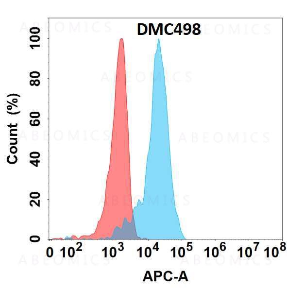 Figure 1. Flow cytometry analysis with Anti-GDNF (DMC498) on Expi293 cells transfected with human GDNF (Blue histogram) or Expi293 transfected with irrelevant protein (Red histogram).
