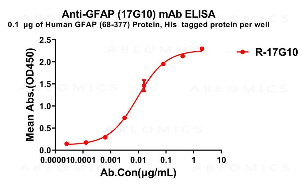 Figure 1. ELISA plate pre-coated by 1 μg/ml (100 μl/well) Human GFAP(68-377) protein, His tagged protein can bind Rabbit anti-GFAP(68-377) monoclonal antibody(clone: 17G10) in a linear range of 1-50 ng/ml.