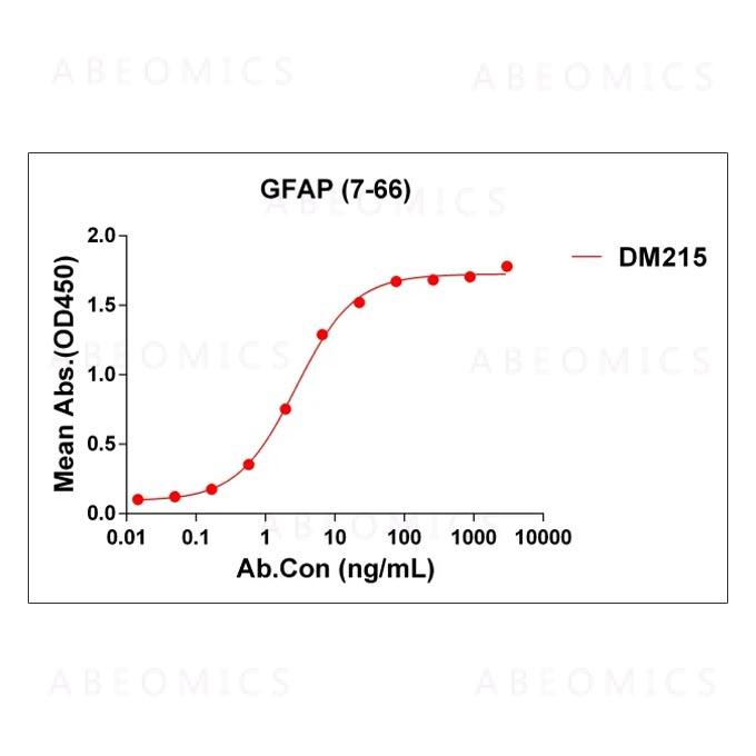 Figure 1. ELISA plate pre-coated by 1 μg/ml (100 μl/well) Human GFAP(7-66) protein, hFc tagged protein can bind Rabbit anti-GFAP(7-66) monoclonal antibody(clone: DM215) in a linear range of 1-50 ng/ml.