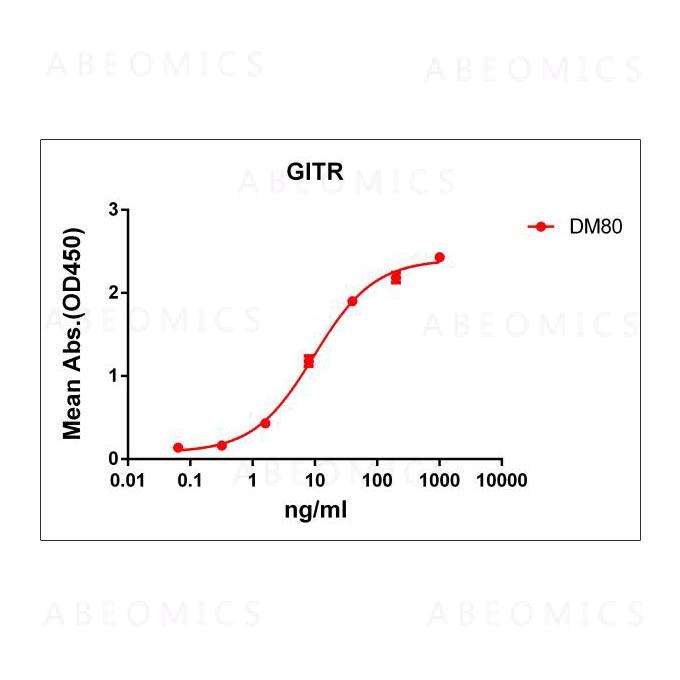 Figure 1. ELISA plate pre-coated by 2 μg/ml (100 μl/well) Human GITR protein, hFc-His tagged protein can bind Rabbit anti-GITR monoclonal antibody (clone: DM80) in a linear range of 1-100 ng/ml.