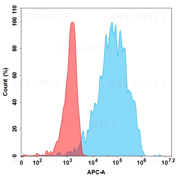 Figure 1. Flow cytometry analysis with Anti-GITR/TNFRSF18(ragifilimab) mAb 1 µg/mL on Expi293 cells transfected with Human GITR (Blue histogram) or Expi293 transfected with irrelevant protein (Red histogram).