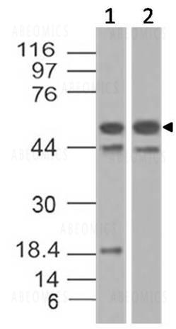 Figure:1- Expression analysis of Glut-4. Anti-Glut-4 antibody (Clone: ABM5D66) was tested at 2 µg/ml on (1) 293 and (2) HT-29 lysates.