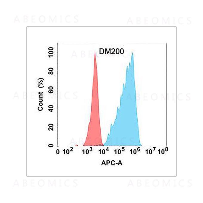Figure 1. Flow cytometry analysis with Anti-GM-CSF (DM200) on Expi293 cells transfected with human GM-CSF (Blue histogram) or Expi293 transfected with irrelevant protein (Red histogram).