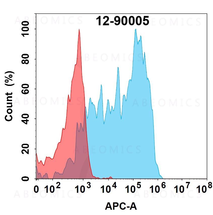 Figure 1. Flow cytometry analysis with 15μg/mL Anti-GM-CSFR(mavrilimumab biosimilar) mAb (12-90005) on Expi293 cells transfected with Human GM-CSFR protein (Blue histogram) or Expi293 transfected with irrelevant protein (Red histogram).