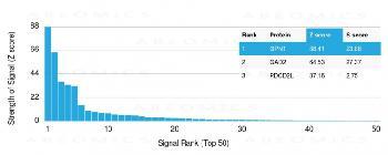 Fig.1: Analysis of Protein Array containing more than 19,000 full-length human proteins using GPN1 Mouse Monoclonal Antibody (GPN1/2350) Z- and S- Score: The Z-score represents the strength of a signal that a monoclonal antibody (MAb) (in combination with a fluorescently-tagged anti-IgG secondary antibody) produces when binding to a particular protein on the HuProtTM array. Z-scores are described in units of standard deviations (SD's) above the mean value of all signals generated on that array. If targets on HuProtTM are arranged in descending order of the Z-score, the S-score is the difference (also in units of SD's) between the Z-score. S-score therefore represents the relative target specificity of a MAb to its intended target. A MAb is considered to specific to its intended target, if the MAb has an S-score of at least 2.5. For example, if a MAb binds to protein X with a Z-score of 43 and to protein Y with a Z-score of 14, then the S-score for the binding of that MAb to protein X is equal to 29.