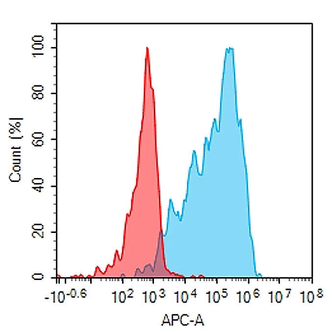 Figure 1. Flow cytometry analysis with 10μg/mL Anti-GPR75 (12B6) mAb on Expi293 cells transfected with human GPR75 (Blue histogram) or Expi293 transfected with irrelevant protein (Red histogram).