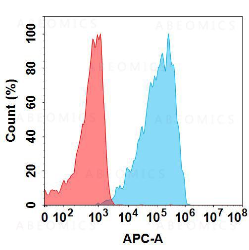 Figure 1. Flow cytometry analysis with 1μg/mL Anti-GPRC5D(LM305 biosimilar) mAb on Expi293 cells transfected with Human GPRC5D protein (Blue histogram) or Expi293 transfected with irrelevant protein (Red histogram).