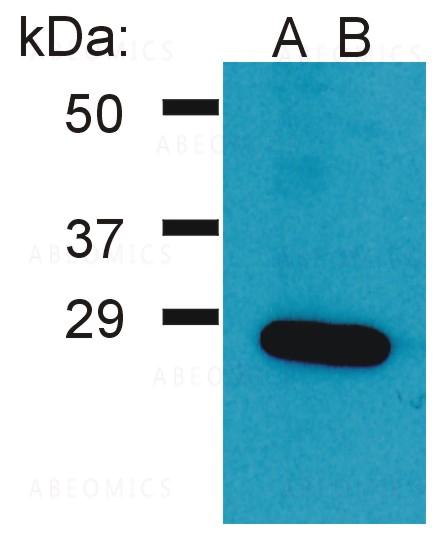 Figure 1: Western Blotting analysis (reducing conditions) of Ramos cell lysate using two batches of rabbit anti-Grb2 polyclonal (A, B).