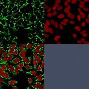 Fig. 1: Immunofluorescence Analysis of MeOH-fixed HeLa cells labeled with HIF1 alpha Mouse Monoclonal Antibody (HIF1A/84) followed bygoat anti-mouse IgG-CF488 (Green). The nuclear counterstain is Reddot (Red).