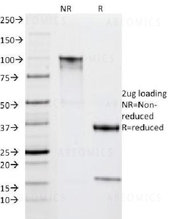 Fig. 1: SDS-PAGE Analysis Purified HLA-DRA Mouse Monoclonal Antibody (IPO-10). Confirmation of Integrity and Purity of Antibody.