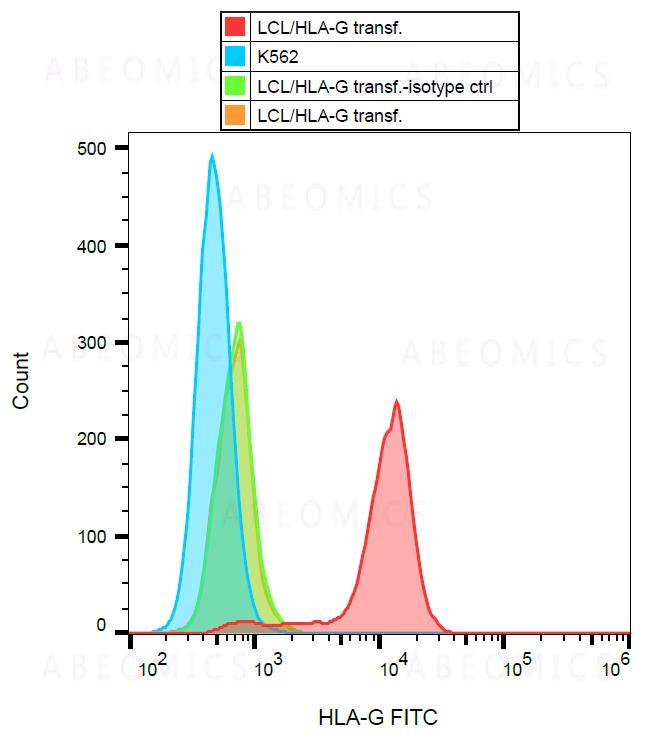 Figure1: Surface staining of HLA-G1 transfectants (LCL-HLA-G1) using anti-HLA-G (MEM-G/9) FITC.