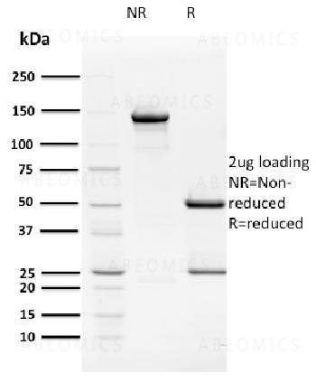 Fig. 1: SDS-PAGE Analysis Purified Mouse Monoclonal Antibody HPV16 E2 (Human Papilloma Virus 16). Confirmation of Purity and Integrity of Antibody.