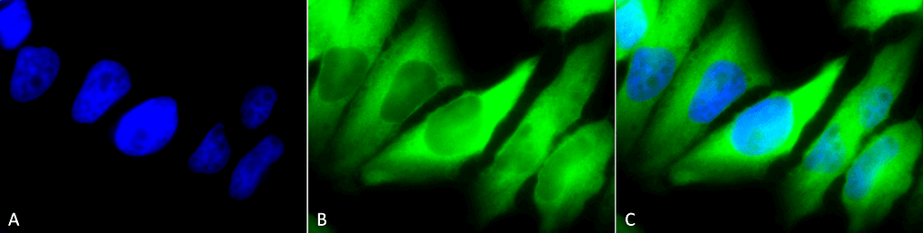 Figure1 : Mouse Anti-Hsp90 alpha/beta Antibody [Hyb-K41220A]used in Immunocytochemistry/Immunofluorescence (ICC/IF) on Human HeLa Cells
